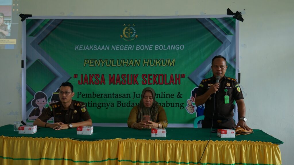 Kejari Bone Bolango – Selasa, 20 Agustus 2024 telah dilaksanakan kegiatan penyuluhan hukum Jaksa Masuk Sekolah di SMP Negeri 2 Suwawa dengan materi Pemberantasan Judi Online dan Pentingnya Budaya Menabung. Bahwa kegiatan Jaksa Masuk Sekolah dilaksanakan oleh Kepala Seksi Intelijen Kejaksaan Negeri Bone Bolango Santo Musa, S.H., M.H., didampingi oleh Plt. Kepala Seksi Bidang Perdata dan Tata Usaha Negara Kahfi Yudha Sulthoni, S.H., bersama staf bidang Intelijen dan staf Datun. (Daffa)